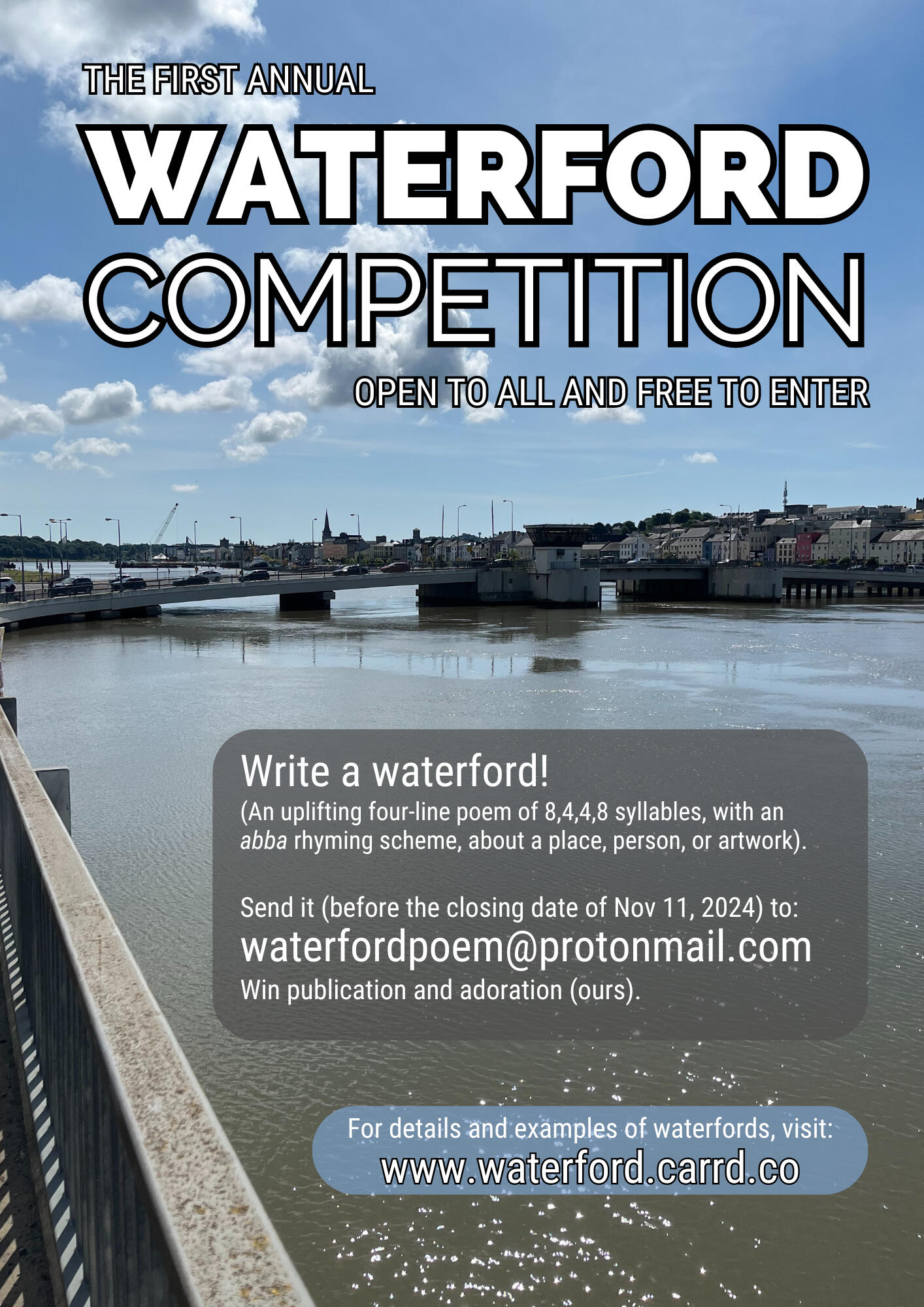 The 2025 competition closed for submissions at midnight on November 15th. The 2026 competition will be announced in May - watch this space!If you are composing your waterfords in preparation for the competition, please make sure that each one has a title, the correct abba rhyming scheme, and has four lines of the right length (8. 4. 4. 8, syllables).Please Note: this contact form is for entries only. If you have a press enquiry, a question not answered by the FAQs, or any other reason for contact which isn't an entry, then please use this email instead.Remember:The waterford is hard to write,
